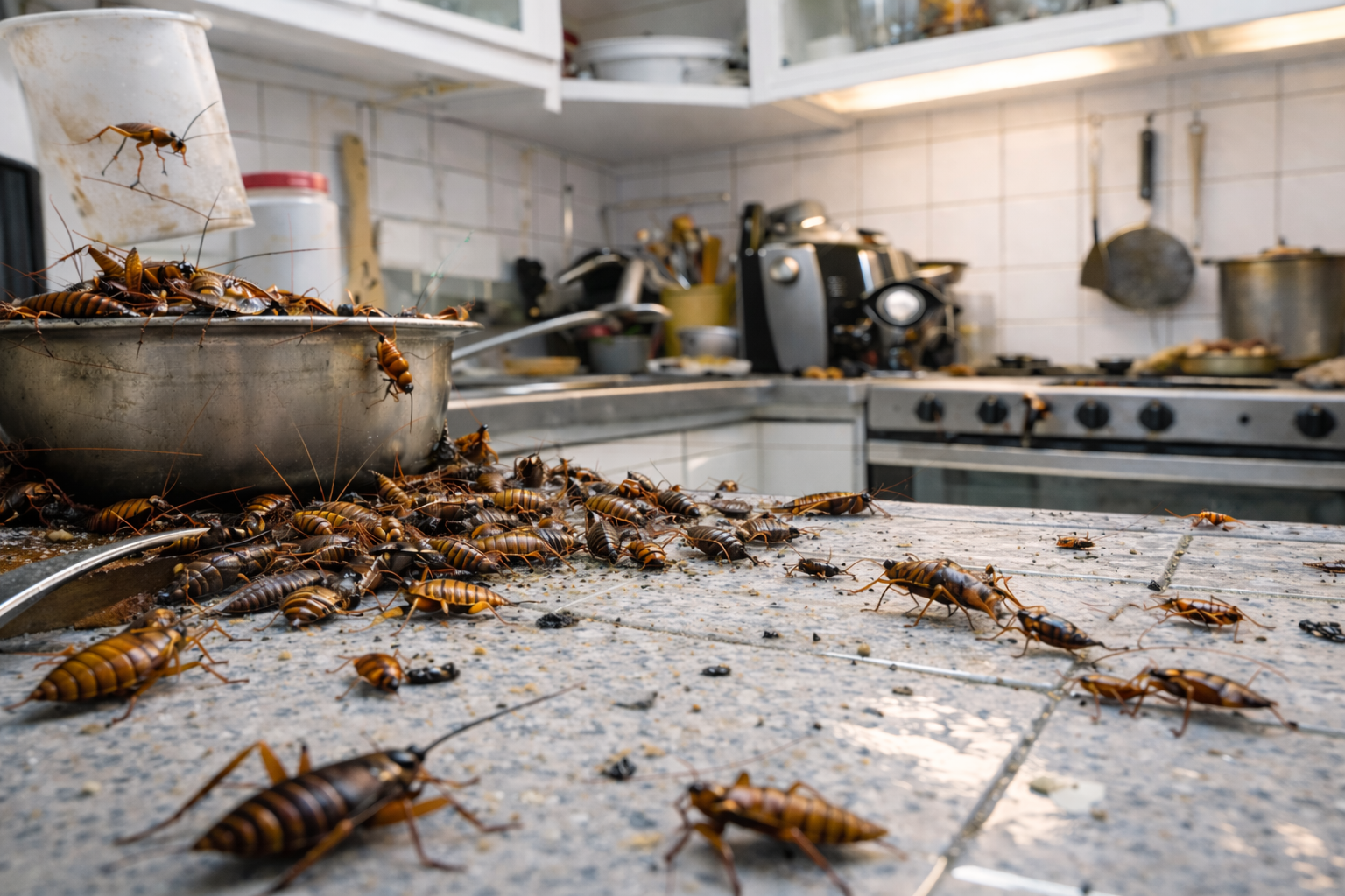 - Roaches in kitchens, pantries, and bathrooms